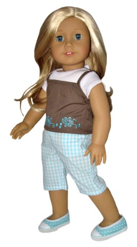 Set includes a white t-shirt, a brown tank top with aqua embroidery, and aqua/white checked capri pants. Includes aqua dot sneaker flats. ***DOLL AND HAIR ACCESSORIES NOT INCLUDED***