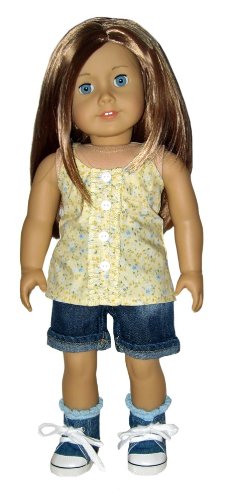 ***DOLL AND HAIR ACCESSORIES NOT INCLUDED***The pale yellow top has blue flowers, ruffles, and decorative buttons. The back closes with velcro. The denim shorts have pockets and cuffs. Comes with sneakers and socks.