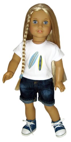 Blue Sneakers, Surfboard Tee, and Denim Shorts. Doll Clothes Fit 18" American Girl Doll. Review
