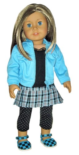 The turquoise hoodie has pockets and a zip front. The black tank top has lace trim. The turquoise and black plaid skirt has an elastic back. Comes with black leggings with white dots and checked shoes. ***DOLL AND HAIR ACCESSORIES NOT INCLUDED***