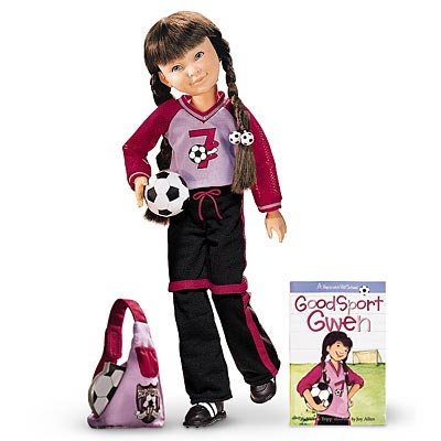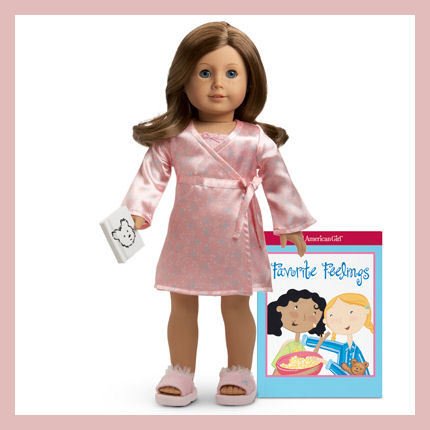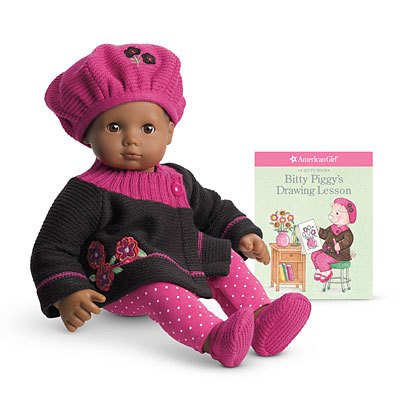The red knit top has a black and white checked flower on the front, puff sleeves, and a velcro closure in the back. The faded denim skirt has pleats, silver studs, and an elastic back. Comes with black and white zebra-print leggings, black socks, and red Mary Janes. ***DOLL AND HAIR ACCESSORIES NOT INCLUDED***