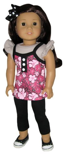 The grey top has ruffles and a velcro closure in the back. The dark pink top has a tropical hibiscus print and decorative buttons. Comes with black leggings. ***DOLL AND HAIR ACCESSORIES NOT INCLUDED***