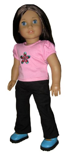 Turquoise Mary Janes, Pink Top with Turquoise Flower, and Black Pants. Doll Clothes Fit 18" American Girl Doll. Review