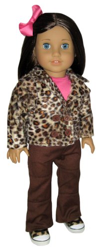***DOLL AND HAIR BOW NOT INCLUDED*** The animal-print jacket closes with snaps and has decorative buttons. Comes with brown flare-leg pants and a hot pink t-shirt and sneakers.